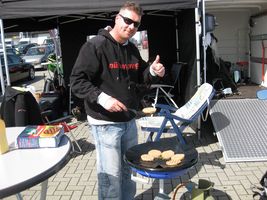 Tijdens de lunchpauze -waarbij we traditiegetrouw dampende gyros en shoarma op de sköttelbraai hadden liggen- werden we vereerd door een aantal Nederlandse fans die ook afgereisd waren naar het mooie circuit van Zolder om aldaar te komen kijken naar onze stuurmanskunsten en vliegwerk. Errug gezellig boys, thanks!! Meteen aanschuiven maar en mee eten met de heerlijke door “Poulus” gemaakte bbq lunch a la FastFoodRacing recept!