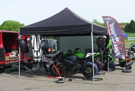 Mooi op tijd aangekomen in Heteren hebben wij de spullen en de motoren uitgeladen en de stand opgezet met onze Fast Food Racing spullen en die van het Noppers Racing Team. Een mooie stand al zeg ik het zelf waar wij onze spullen en die van onze sponsor, Marushin Helmets, uit konden stallen.