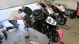 Na alles uitgeladen te hebben en de pitbox ingeruimd kon de motor naar de keuring. Even later kwam Marcel mij vertellen dat mijn bike afgekeurd werd ,ik dacht dat zal toch geen grap zijn ,ik was ervan overtuigd alles goed voor elkaar te hebben maar helaas was er een voorvork kering lek en dus mocht ik op donderdag-morgen niet aan de eerste training meedoen. Nog geprobeerd om van de Race Academy een BMW te ritselen maar dat ging helaas ook niet door,wat ook wel weer te begrijpen is.